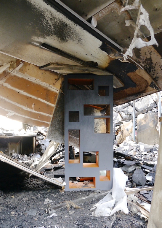 Das Bild zeigt unseren Showroom am Morgen nach dem Brand. Wir wollen Ihnen dieses Foto nicht vorenthalten, denn es zeigt nicht nur die Verwüstung durch das Feuer, sondern auch die Standhaftigkeit unserer Möbel. Das Reading Cat, was Sie auf dem Foto sehen, ist zwar nicht feuerfest aber dennoch so stabil, das die ganze Decke des Raumes auf ihm lastet und es dem Druck wiedersteht. Wir haben dies als ein gutes Zeichen gesehen und wollen dies auch mit Ihnen teilen.